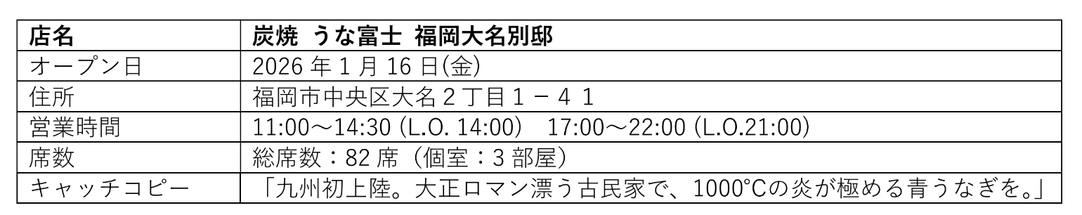 2026年1月16日(金)、福岡県福岡市中央区大名に九州エリア初出店となる新店舗『炭焼 うな富士 福岡大名別邸』をグランドオープンいたします。オープンを記念しまして、1月13日(火)にレセプションを予定しております。詳細はこちら